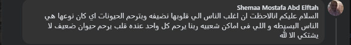 وكتب أحد المعلقين عبر “فيسبوك”: “أنا لاحظت إن أغلب الناس إلى قلوبها نضيفة وبترحم الحيونات أي كان نوعها هي الناس البسيطة واللي في أماكن شعبية.. ربنا يرحم كل واحد عنده قلب يرحم حيوان ضعيف لا يشتكي إلا لله”.