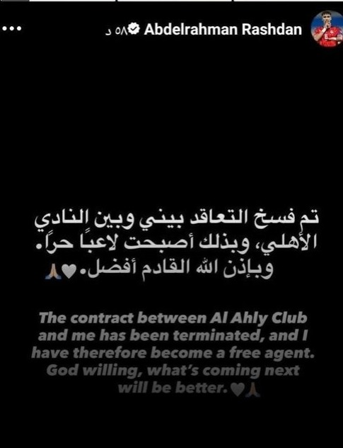 وكتب رشدان عبر حسابه الشخصي: “تم فسخ التعاقد بيني وبين النادي الأهلي، وبذلك أصبحت لاعبًا حرًا، وبإذن الله القادم أفضل”.