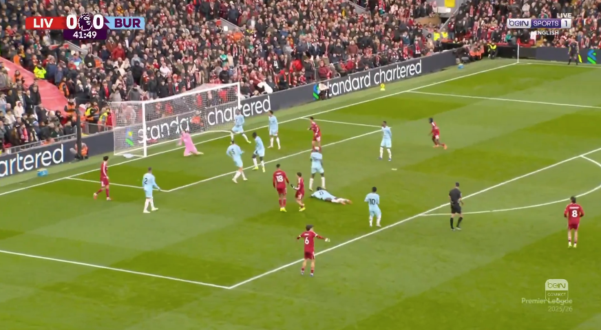 وسدد فلوريان فيرتز، لاعب ليفربول، كرة قوية من خارج منطقة الجزاء ولكن تصدى لها دوبرافكا، حارس مرمى بيرنلي بنجاح.