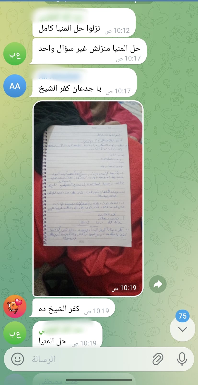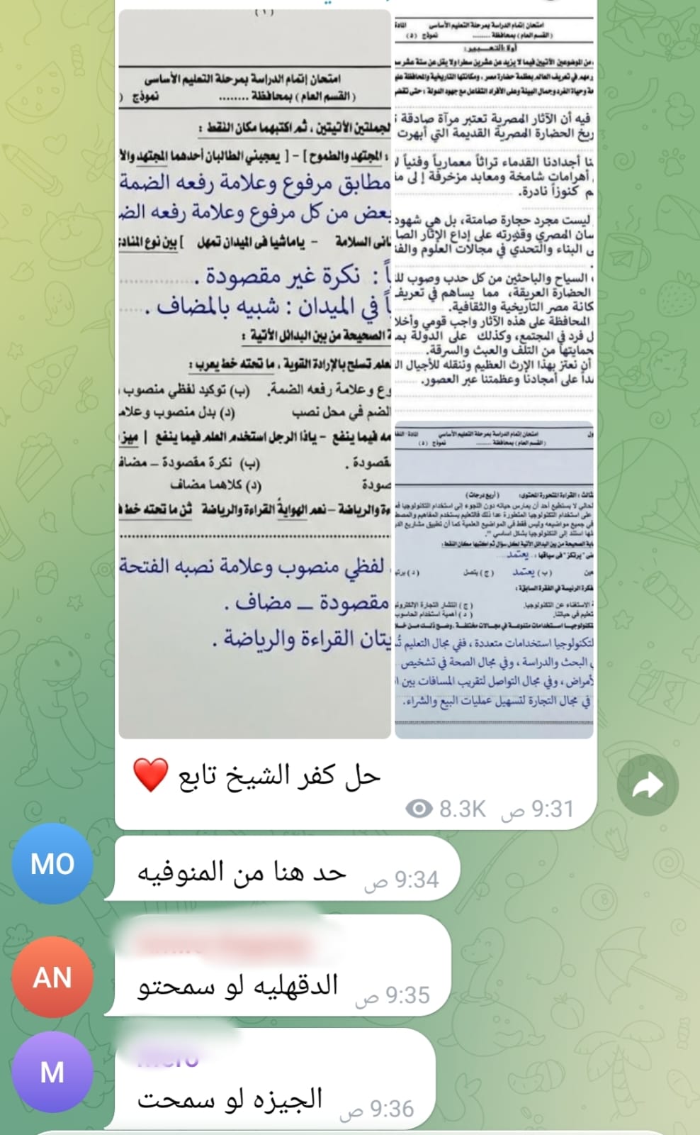 تغيّر مسار محتوى الجروب بشكل كامل، وبدلًا من تداول امتحانات ليبيا، بدأت تظهر طلبات مباشرة لتسريب امتحانات الشهادة الإعدادية في مصر، شملت محافظات عدة، من بينها الشرقية والغربية وكفر الشيخ وسوهاج، والغريب هو طلب "كارت شحن" مقابل إرسال الامتحانات.