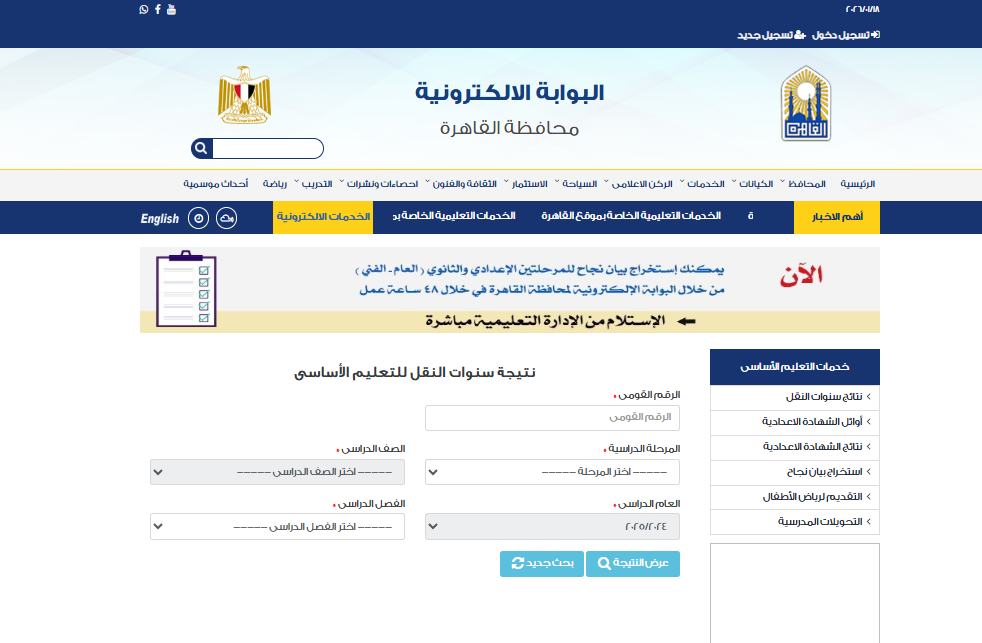 يمكن للطلاب وأولياء الأمور الاستعلام عن نتيجة الصف الثاني الإعدادي برقم الجلوس والاسم في محافظة القاهرة فور اعتمادها رسميًا، من خلال بوابة التعليم الأساسي التابعة لمديرية التربية والتعليم بالقاهرة، وذلك باتباع الخطوات التالية:
