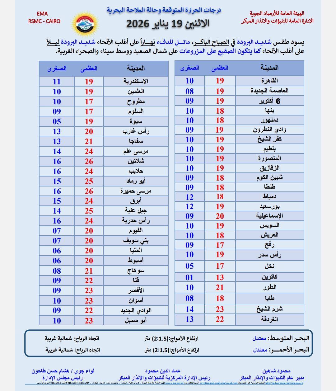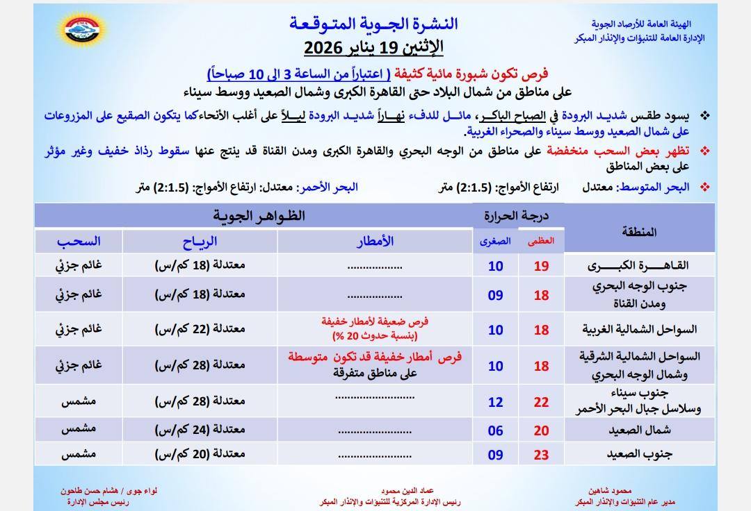 - القاهرة الكبرى: العظمى 19 درجة، الصغرى 10 درجات.