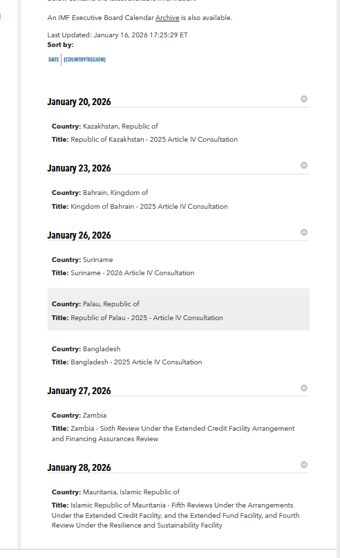ووفق جدول الأعمال المنشور على الموقع الإلكتروني لصندوق النقد الدولي، الذي جرى تحديثه الجمعة الماضية، فإن الدول المقرر مناقشة برامجها خلال الفترة من 20 وحتى 28 يناير الجاري تشمل كازاخستان والبحرين وبنجلاديش وزامبيا وموريتانيا، دون الإشارة إلى إدراج مصر ضمن هذه الاجتماعات.