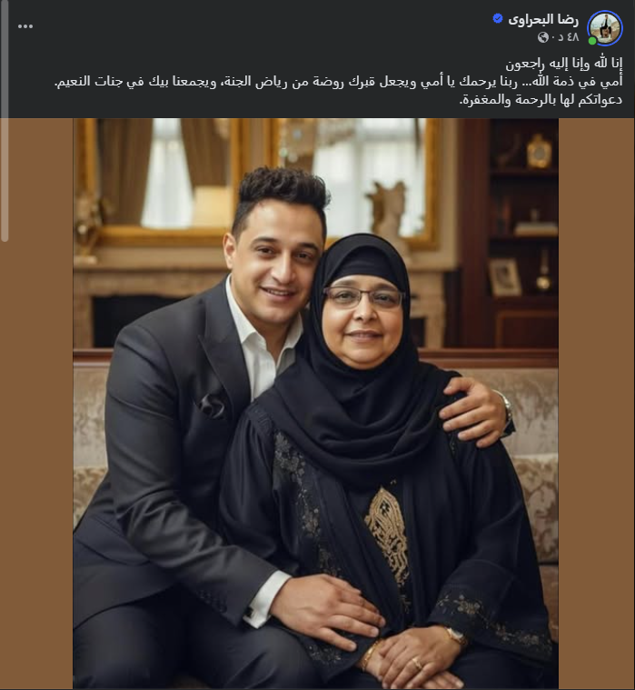 وجاء في البيان المنشور عبر صفحته على “فيسبوك”: "والدة النجم رضا البحراوي ما زالت تحت الرعاية الطبية، وتحتاج فقط الدعاء من الجميع بالشفاء العاجل. نرجو عدم تداول أي أخبار غير مؤكدة حتى الآن".