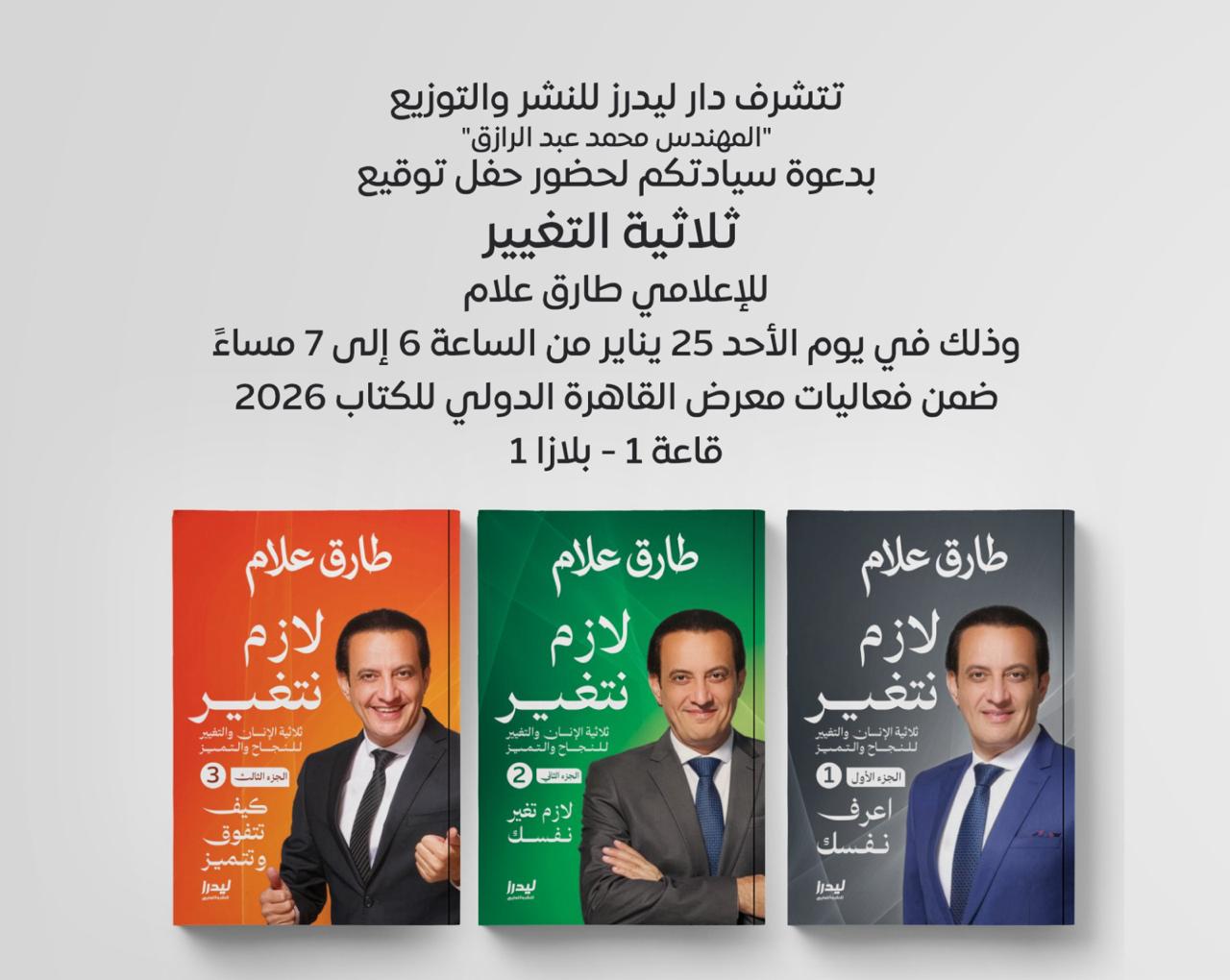 يشارك الإعلامي طارق علام في فعاليات معرض القاهرة الدولي للكتاب 2026، حيث يتواجد في الدورة الـ57 لتوقيع أحدث إصداراته "ثلاثية التغيير"، الصادرة عن دار ليدرز للنشر والتوزيع، وتضم كتابًا في ثلاثة أجزاء تحت عنوان “لازم نتغير”.