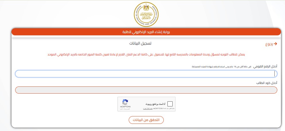- إدخال الرقم القومي للطالب والكود الموجود بإيصال سداد المصروفات.