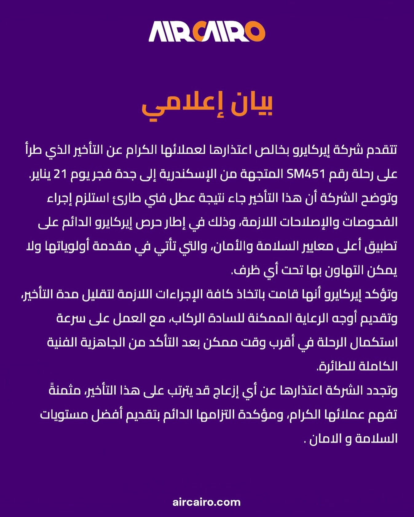 وتقدمت شركة “إير كايرو” بخالص اعتذارها لعملائها عن التأخير الذي طرأ على رحلة رقم M451 المتجهة من الإسكندرية إلى جدة فجر يوم 21 يناير.