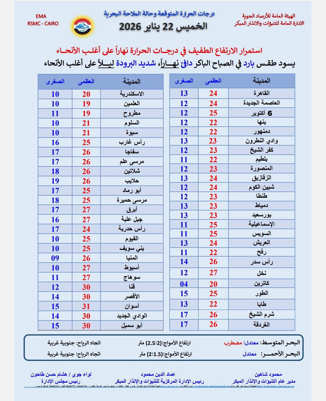 درجات الحرارة اليوم الخميس 22 يناير 2026