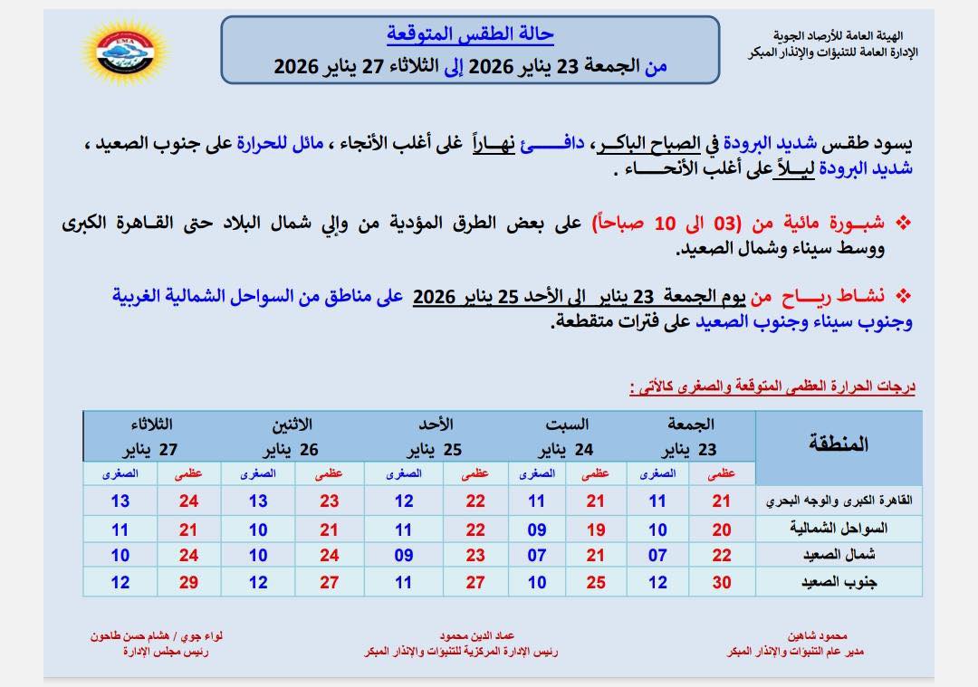 كما يشهد شبورة مائية من الساعة 3 صباحًا إلى الساعة 10 صباحًا على بعض الطرق المؤدية من وإلى شمال البلاد حتى القاهرة الكبرى ووسط سيناء وشمال الصعيد، بالإضافة إلى نشاط رياح من يوم الجمعة 23 يناير إلى الأحد 25 يناير 2026 على مناطق من السواحل الشمالية الغربية وجنوب سيناء وجنوب الصعيد على فترات متقطعة.