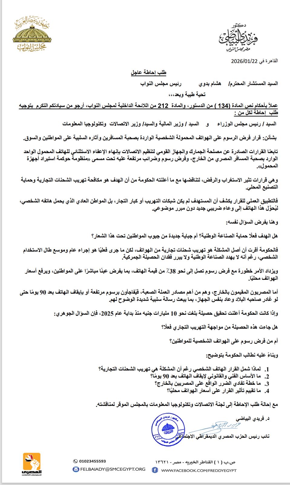 تقدم عضو مجلس النواب، فريدي البياضي، بطلب إحاطة موجّه إلى كل من رئيس الوزراء ووزير المالية، ووزير الاتصالات بشأن قرار فرض رسوم وضرائب على الهواتف المحمولة الشخصية الواردة بصحبة المسافرين من الخارج، وإلغاء الإعفاء الذي كان معمولًا به للهاتف الواحد.