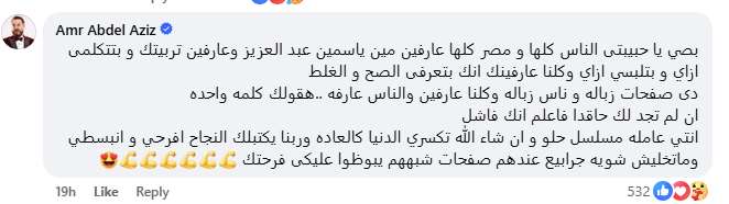 كما دعمها الفنان عمرو عبدالعزيز، قائلًا: "بصي يا حبيبتي الناس كلها ومصر كلها عارفين مين ياسمين عبدالعزيز وعارفين تربيتك وبتتكلمي وتلبسي إزاي".