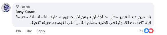 بينما قالت لها متابعة أخرى: "ياسمين عبدالعزيز مش محتاجة تبرهن لإن جمهورك عارف إنك إنسانة محترمة ولازم تاخدي حقك وترفعي قضية".
