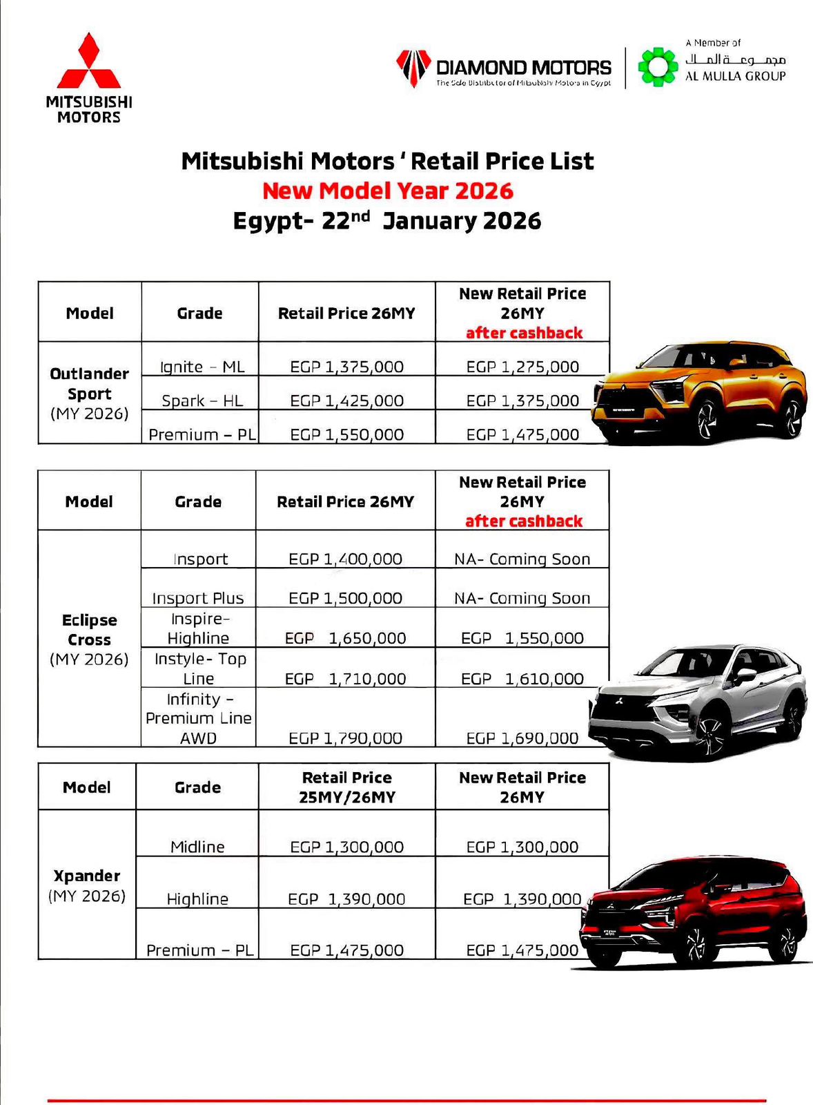 وشهدت أول قائمة أسعار سيارات ميتسوبيشي في 2026، تثبيت أسعار طراز أوتلاند سبورت، وتخفيض أسعار إكليبس كروس للفئات الأكثر تجهيزًا بقيمة 100 ألف جنيه.