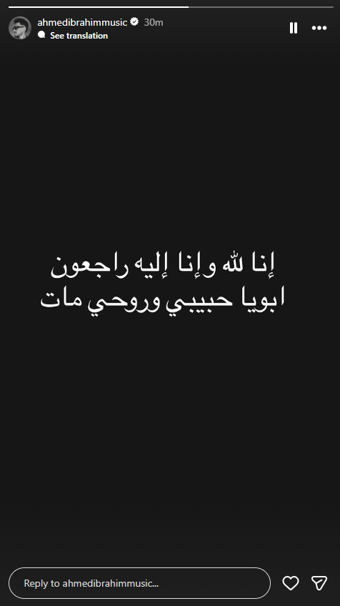 وكتب أحمد إبراهيم ناعيًا والده بكلمات موجعة، قال فيها: "إنا لله وإنا إليه راجعون.. أبويا حبيبي وروحي مات"، في رسالة عبّرت عن حجم الحزن الذي يعيشه لفقدان والده.
