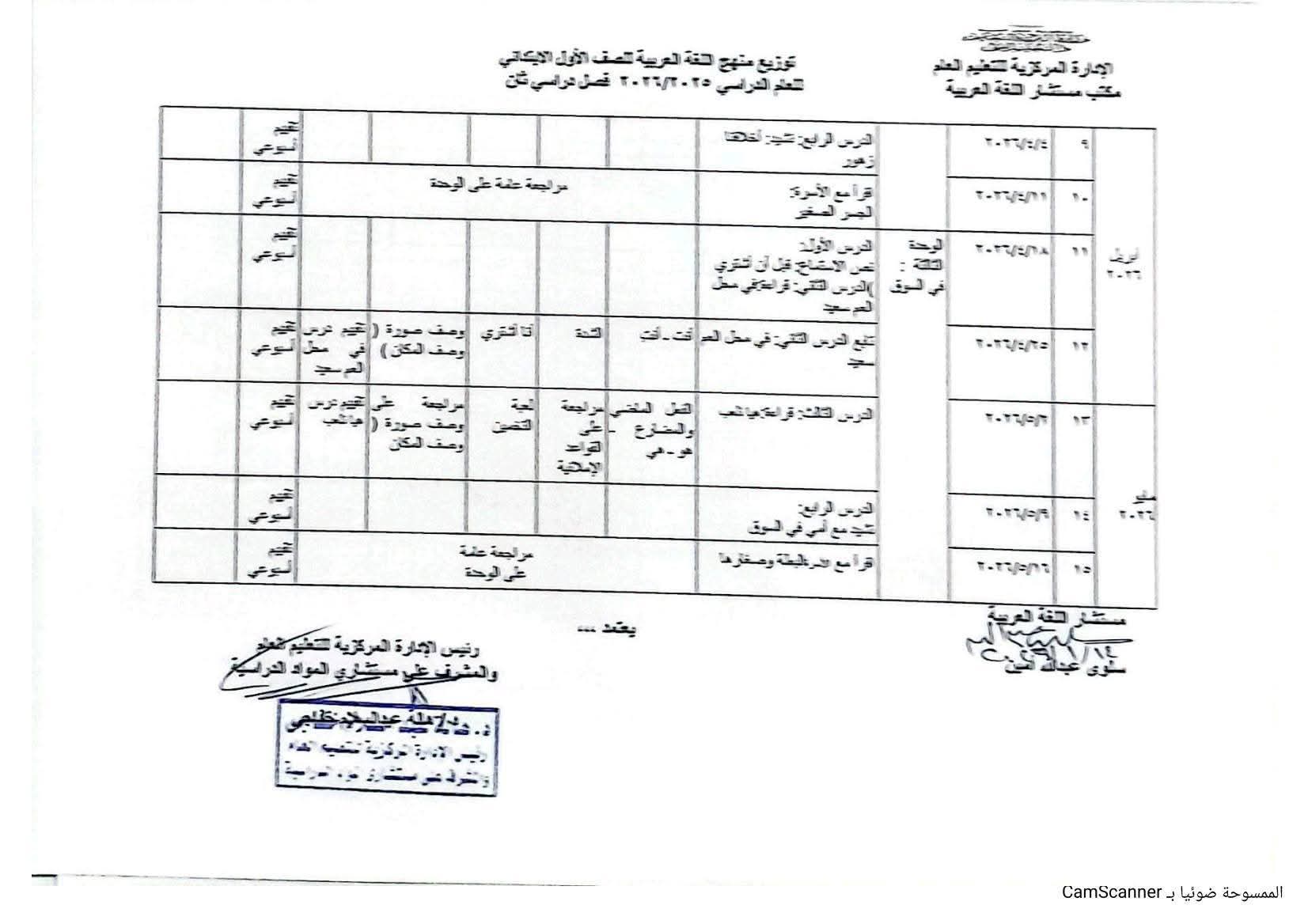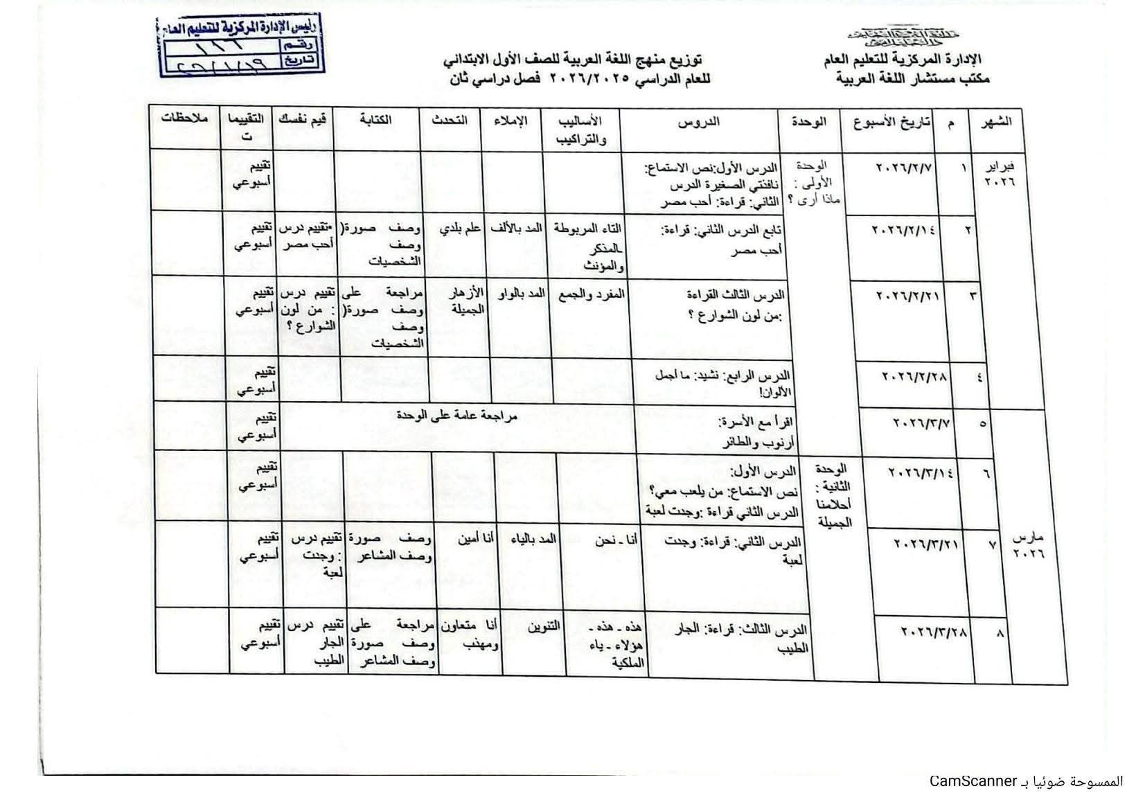 توزيع منهج اللغة العربية الصف الأول الابتدائي الترم الثاني