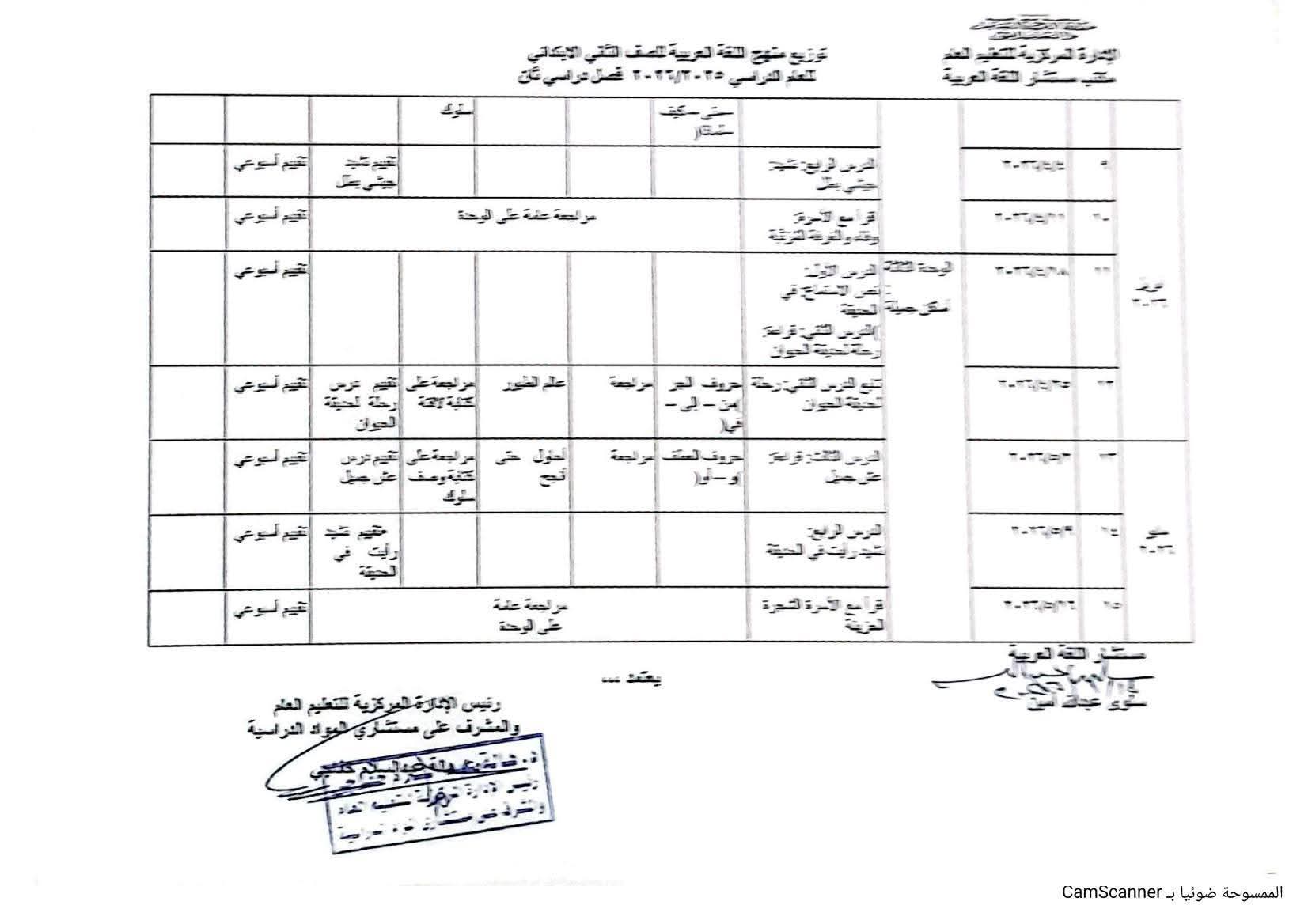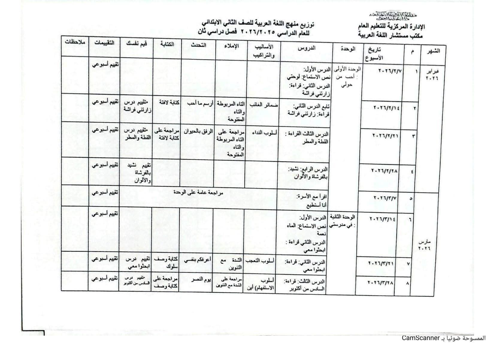توزيع منهج اللغة العربية الصف الثاني الابتدائي الترم الثاني