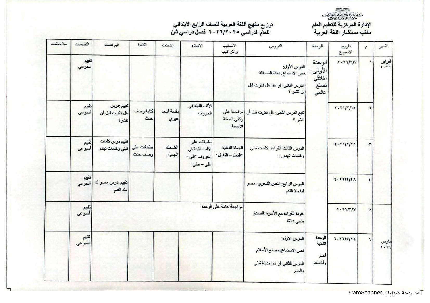 توزيع منهج اللغة العربية جميع الصفوف الابتدائية الترم الثاني 2026