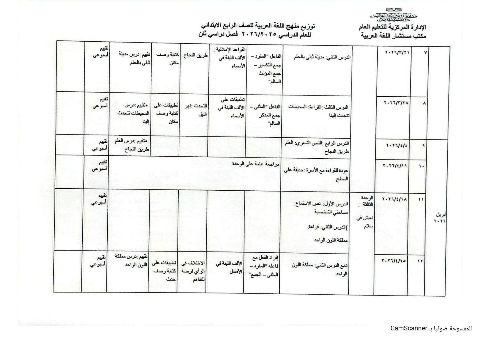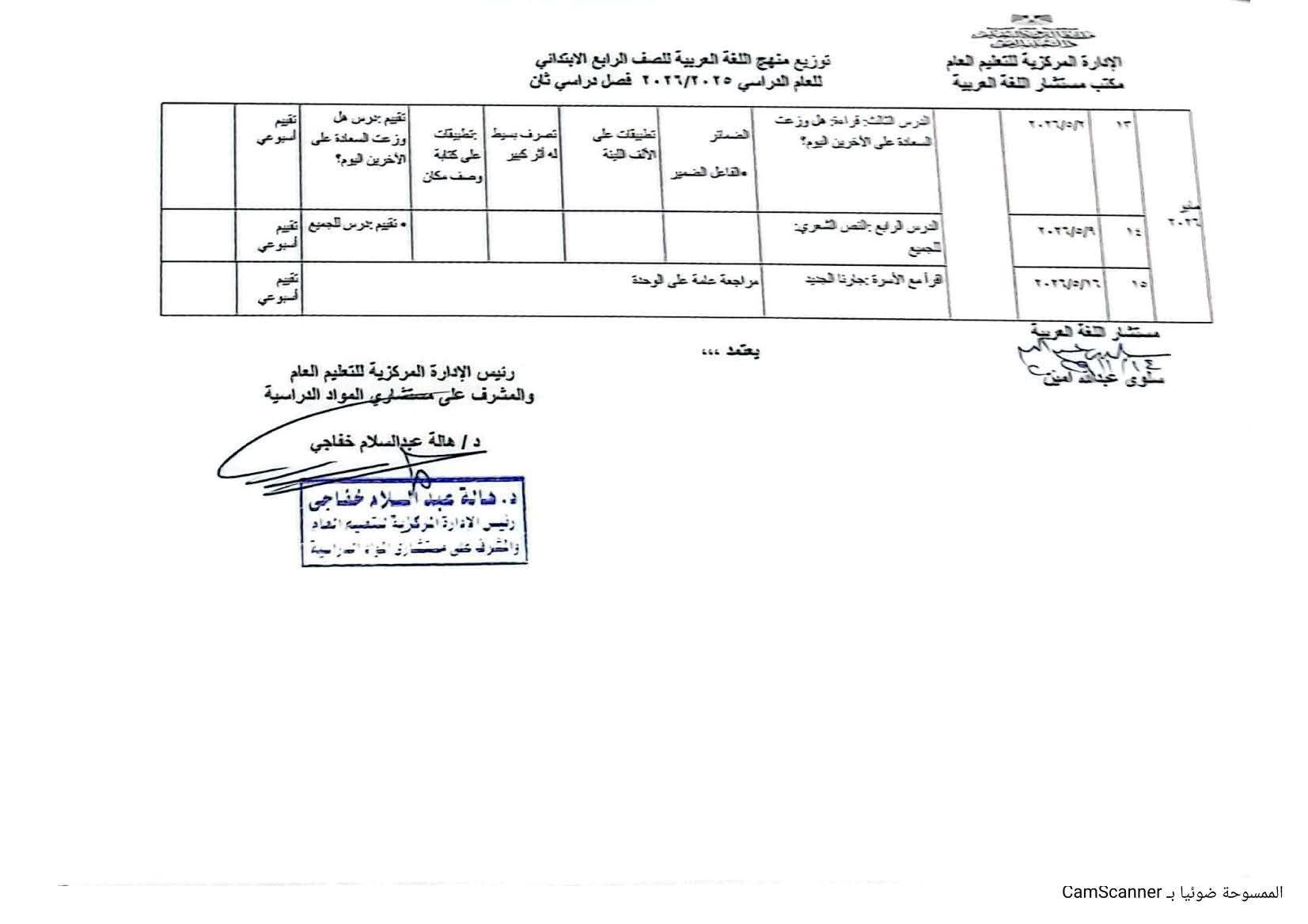 توزيع منهج اللغة العربية الصف الرابع الابتدائي الترم الثاني