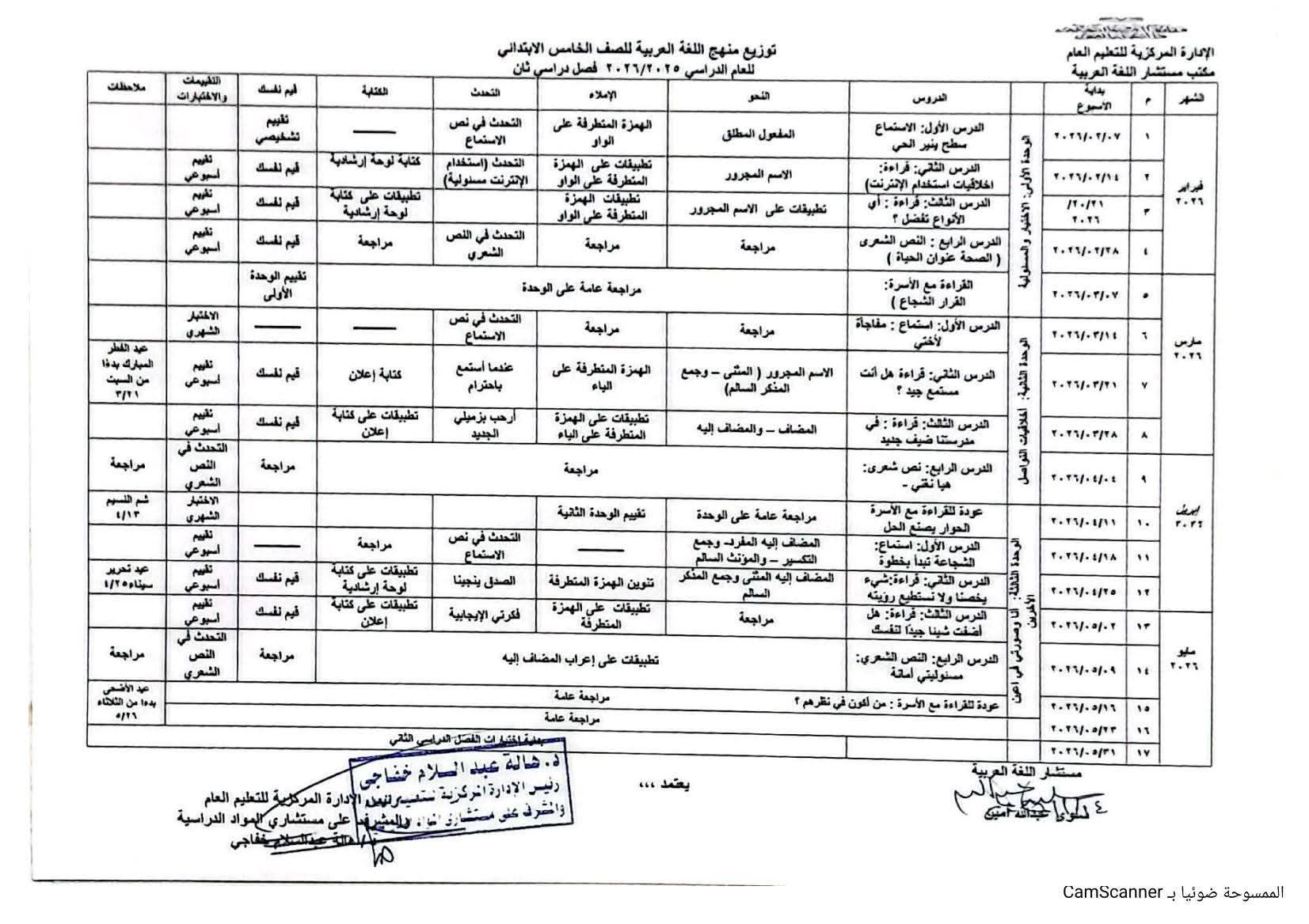 توزيع منهج اللغة العربية الصف الخامس الابتدائي الترم الثاني