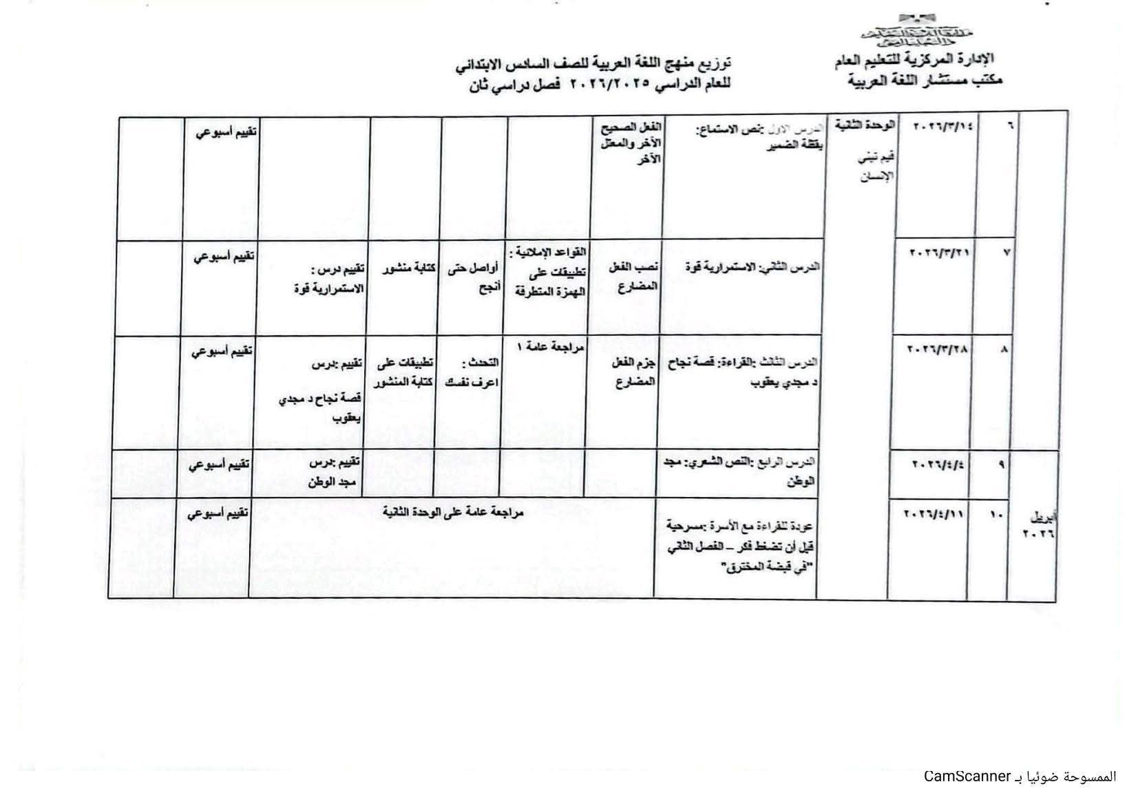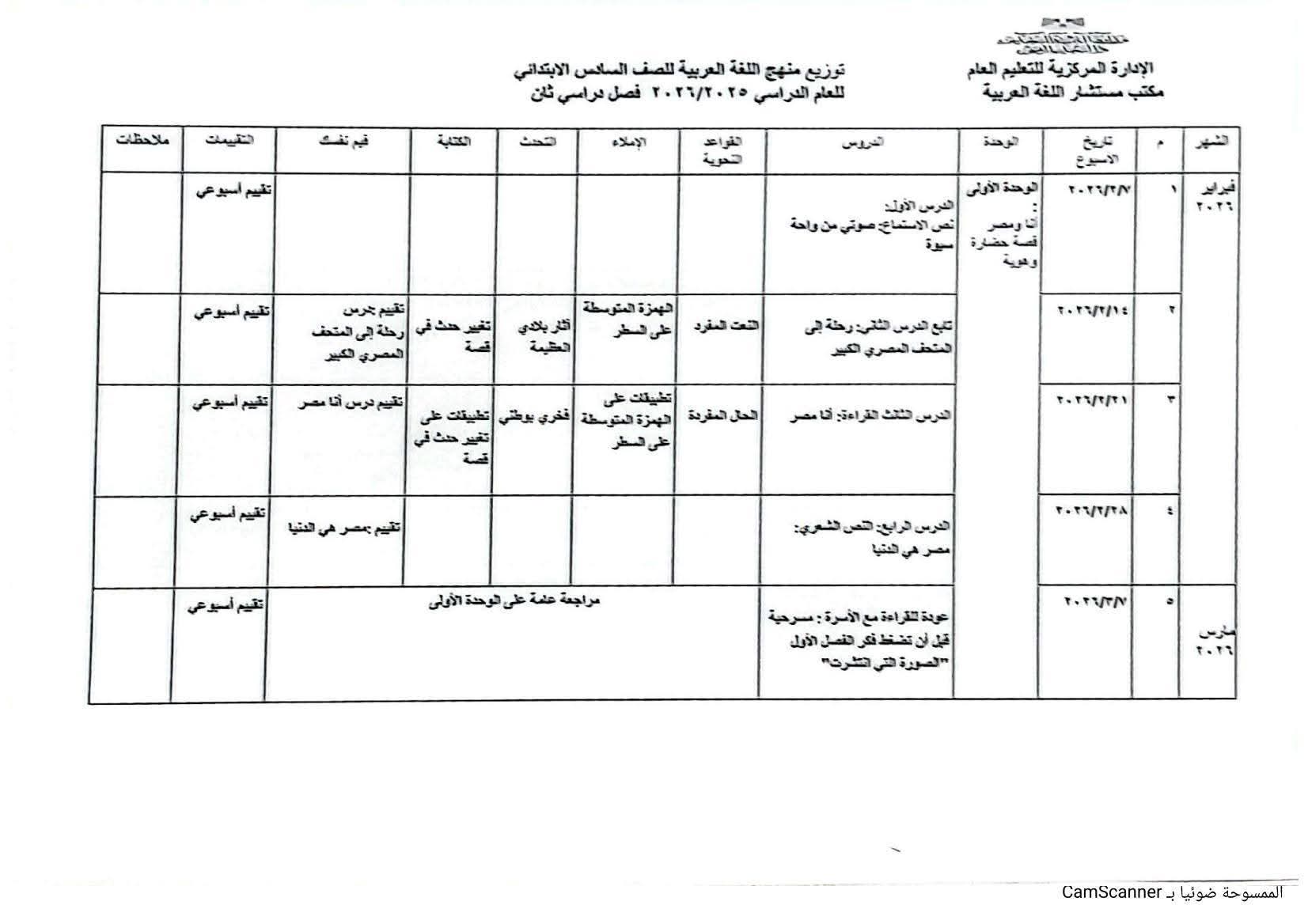 توزيع منهج اللغة العربية الصف السادس الابتدائي الترم الثاني