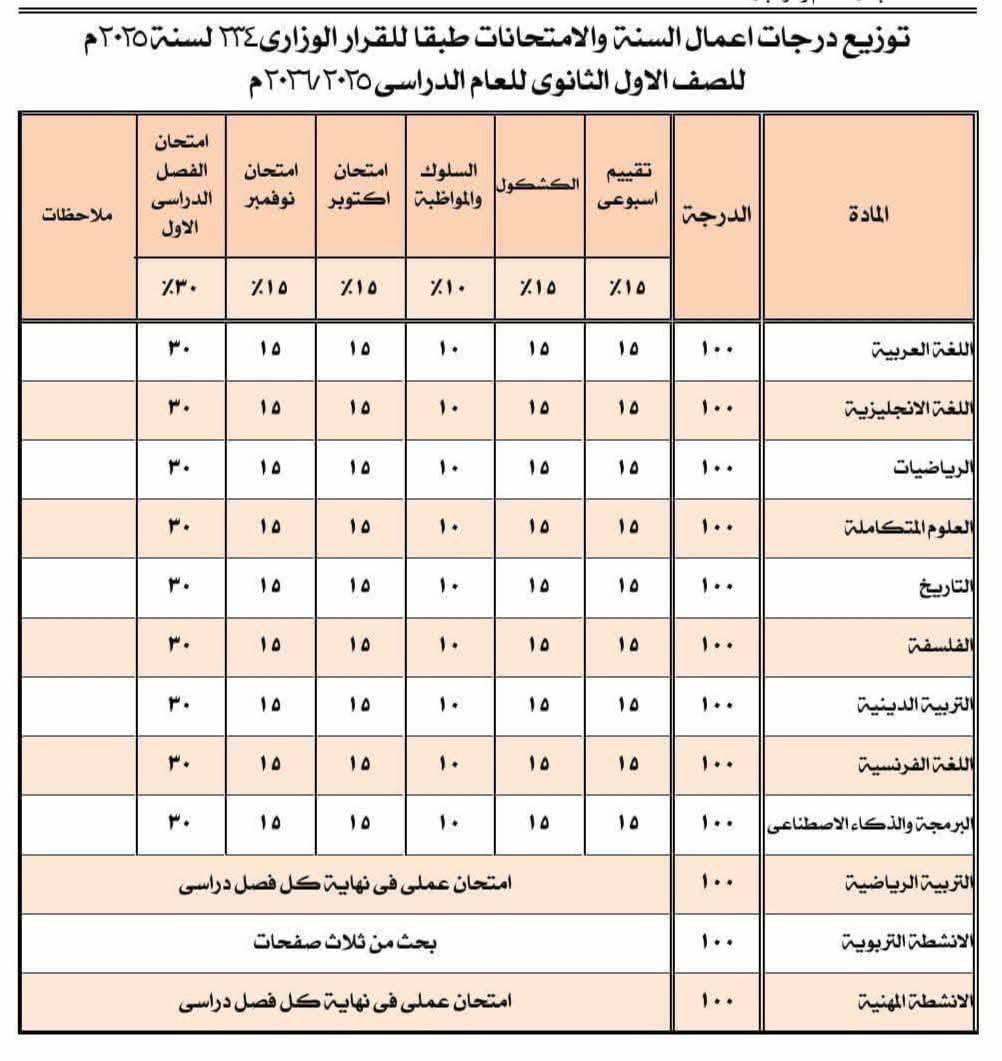 - توزيع الدرجات بين الامتحان النهائي وأعمال السنة.