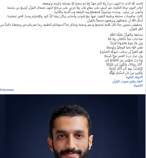 كما أكد امتنانه الكبير لكل من سانده وشجعه، معربا عن شكره لكل كلمات الدعم والدعوات الطيبة، وأن يكون الجميع دائمًا من أهل القرآن.