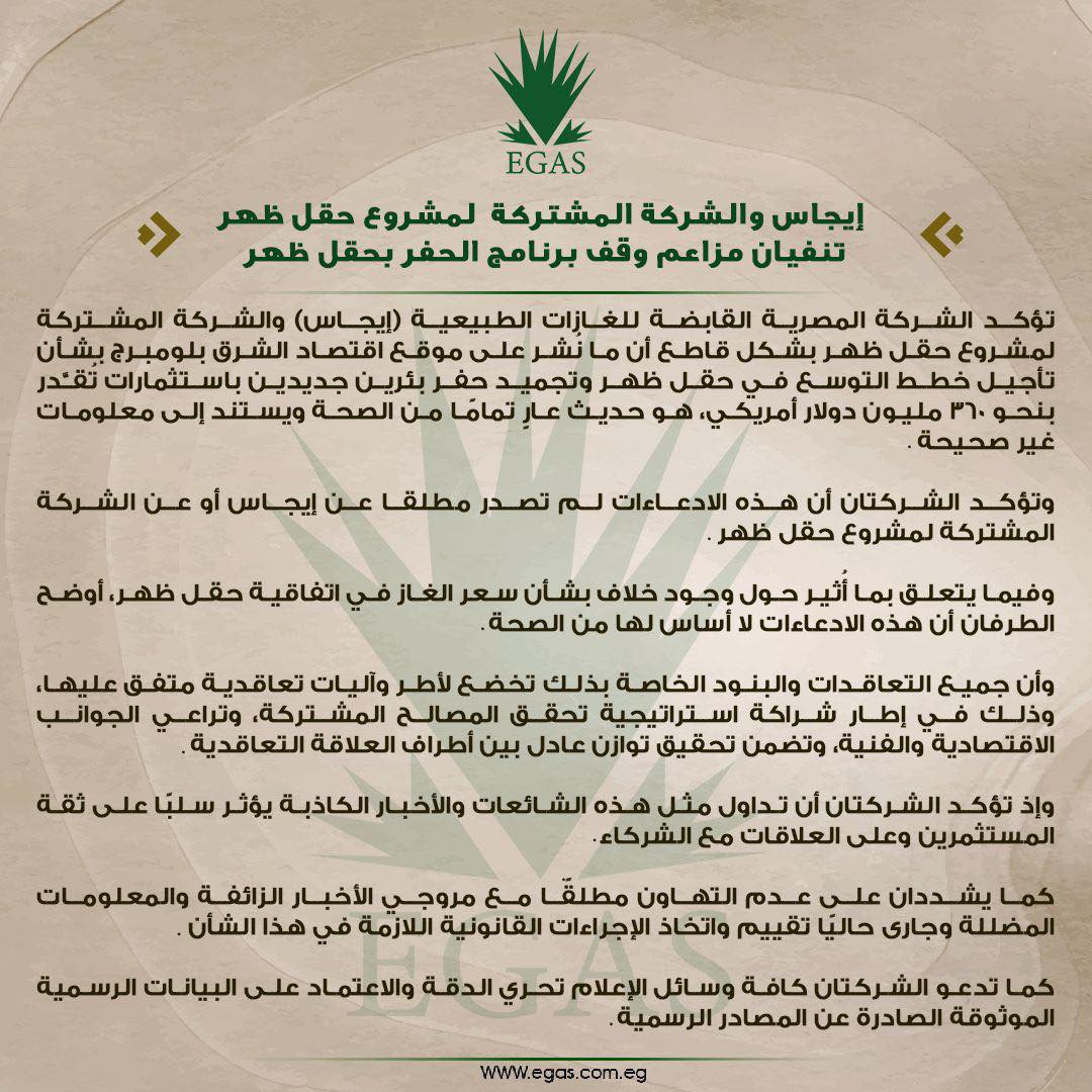وأكدت الشركتان، أن هذه المزاعم لم تصدر مطلقًا عن إيجاس أو عن الشركة المشتركة لمشروع حقل ظهر، وأن ما أُثير حول وجود خلاف بشأن سعر الغاز في اتفاقية الحقل لا أساس له من الصحة، وجميع التعاقدات والبنود الخاصة بذلك تخضع لأطر وآليات تعاقدية متفق عليها بين الأطراف.