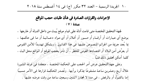 وأوضحت المادة 7 من قانون مكافحة جرائم تقنية المعلومات الصادر برقم 175 لسنة 2018، الحالات التى يتم فيها حجب المواقع الإلكترونية.