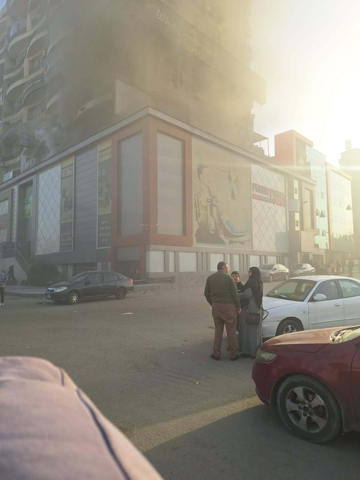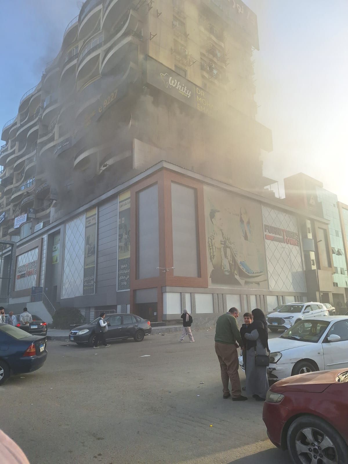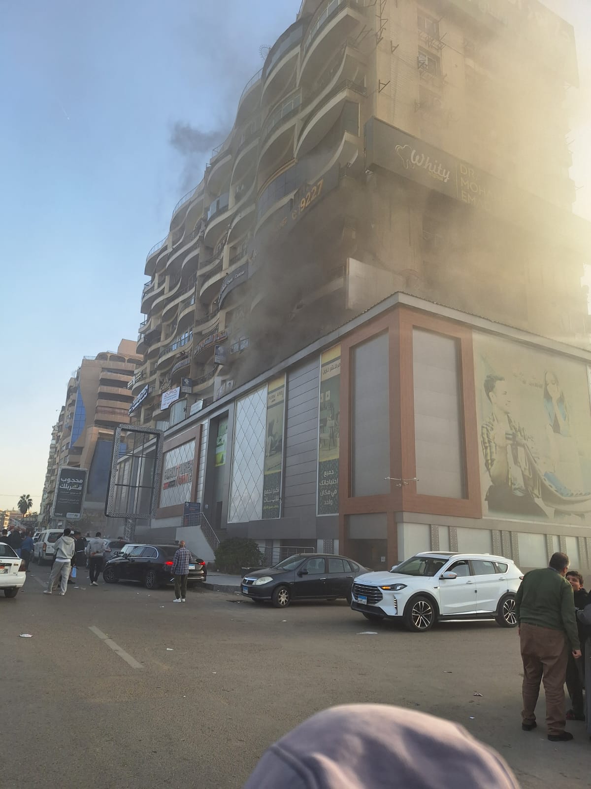 حريق في برج سكني أمام فرع النادي الأهلي بمدينة نصر (صور)