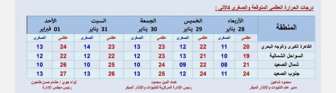 وأعلنت الهيئة العامة للأرصاد الجوية، حالة الطقس الأيام المقبلة من يوم الأربعاء الموافق 28 يناير الجاري إلى الأحد 1 فبراير الجاري.