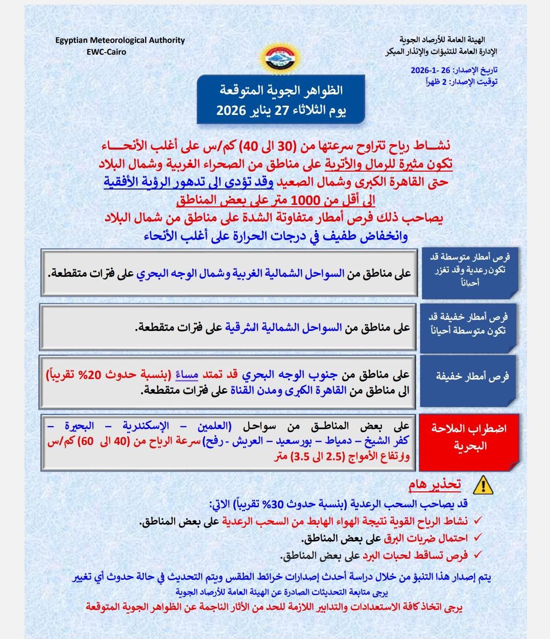حالة الطقس غدا الثلاثاء 27 يناير 2026 والظواهر الجوية المتوقعة