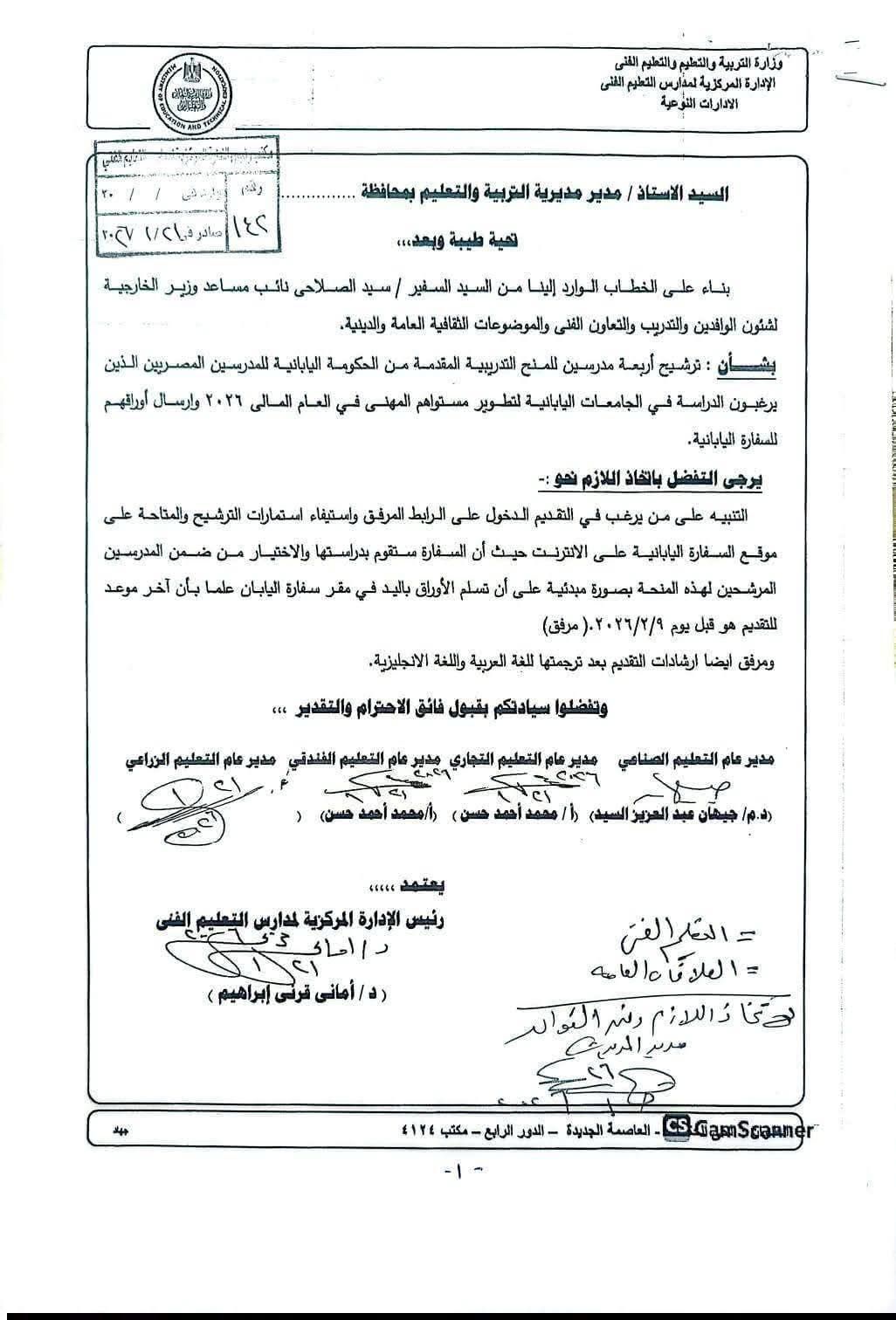 وقالت الوزارة في خطاب مرسل للمديريات التعليمية، إنها تلقت خطابًا من نائب مساعد وزير الخارجية لشئون الوافدين والتدريب والتعاون الفني، السفير سيد الصلاحي، بشأن ترشيح أربعة مدرسين للمنح التدريبية المقدمة من الحكومة اليابانية للمدرسين المصريين الذين يرغبون في الدراسة بالجامعات اليابانية، لتطوير مستواهم المهني في العام المالي 2026 وإرسال أوراقهم للسفارة اليابانية.