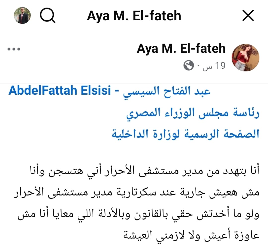 تداول مستخدمو موقع “فيسبوك” منشورات منسوبة لحساب يحمل اسم Aya M. El-fateh (آية الفاتح)، قالت صاحبته إنها تعمل طبيبة بالمكتب الفني في مستشفى الأحرار التعليمي بمحافظة الشرقية، وتضمنت المنشورات ادعاءات بتعرضها لمضايقات وضغوط داخل مقر عملها من قبل بعض العاملين بسكرتارية مدير المستشفى.