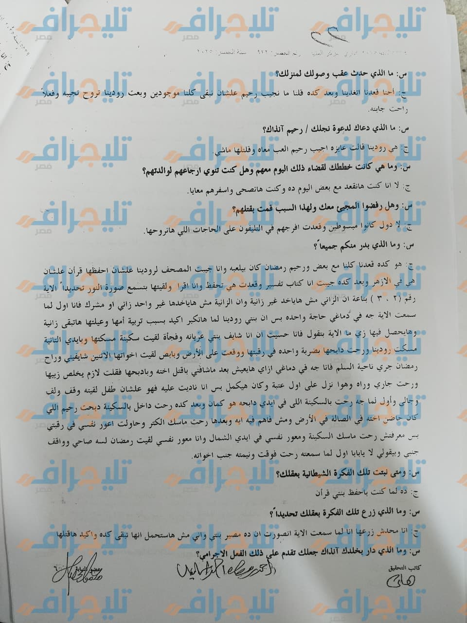وحصلت "تليجراف مصر" على النص الكامل، للتحقيقات مع المتهم، الذي قال إنه يوم الواقعة، جمع أطفاله الثلاثة في منزله لقضاء اليوم معهم، وجلس يحفِّظ ابنته الكبرى "رودينا" (11 عاماً) القرآن الكريم، ثم قرر فجأة أن ينهي حياتها، خوفًا عليها من الانحراف أو الوقوع في جريمة الزنا عندما تكبر بحسب قوله.