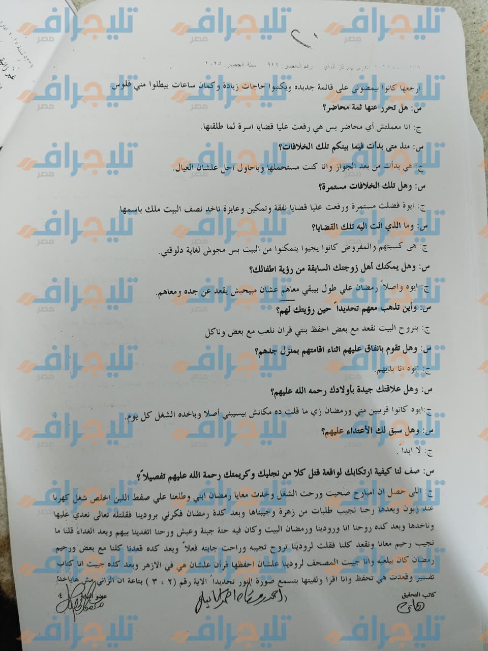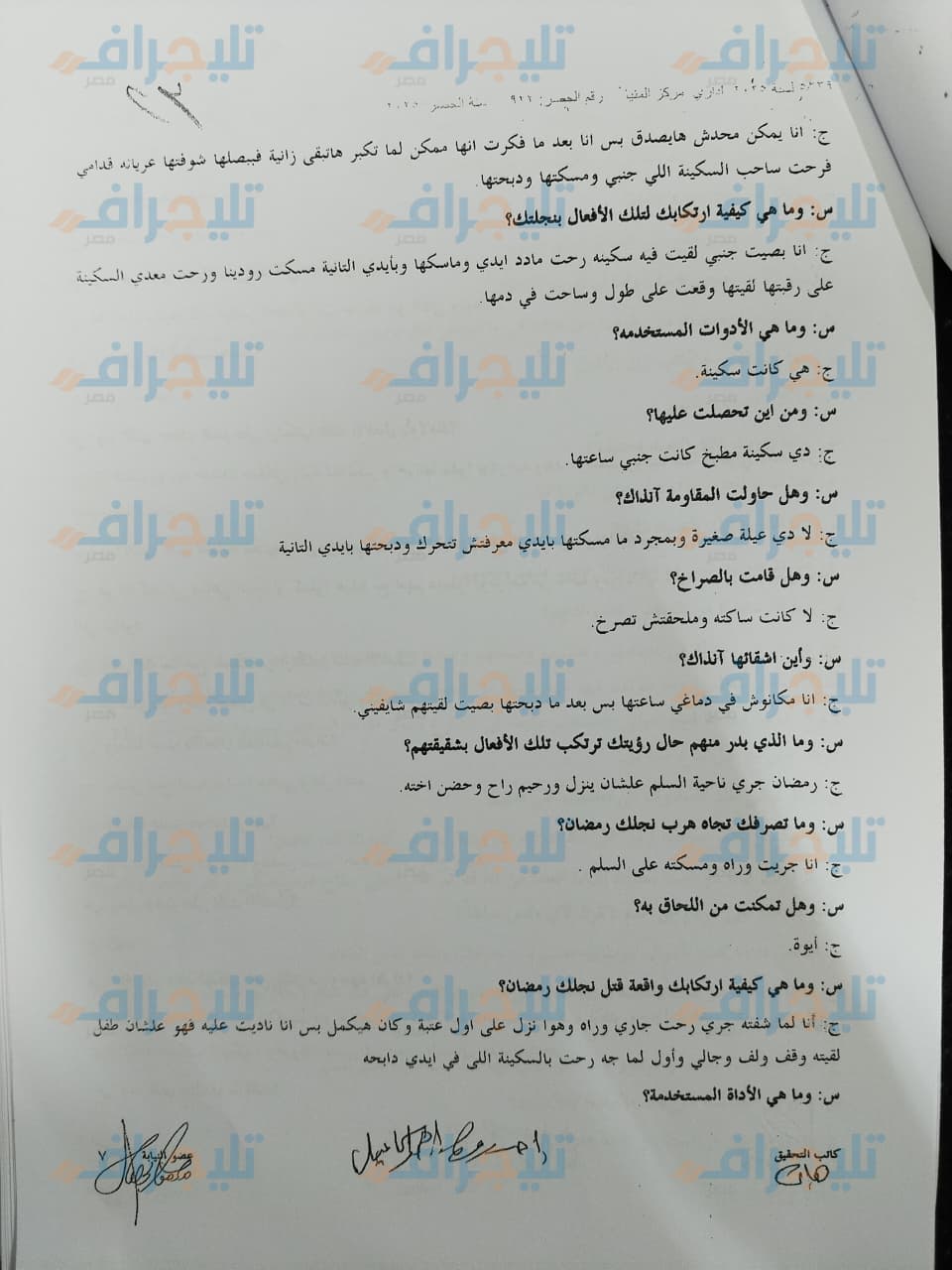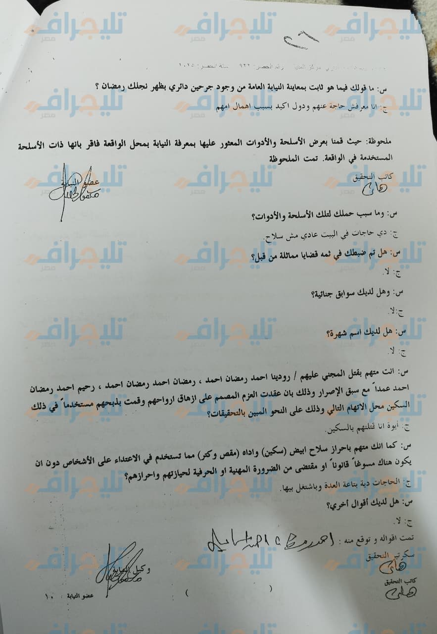 ج: حاولت إنهاء حياتي بـ "كتر" وسكين في رقبتي ويدي وفشلت، سمعت ابني "رمضان" وهو ينازع ويقول "لا يا بابا"، لما سمعته رحت فوقت ونيمته بجوار إخوته، بعد كده نزلت من البيت ووقفت "توكتوك" وتوجهت لمركز الشرطة وسلمت نفسي، و قلتلهم كل حاجة وده كل اللي حصل.