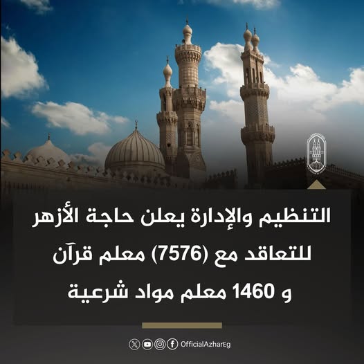 ويأتي هذا الإعلان في إطار مسابقة لتعيين 7576 وظيفة معلم مساعد قرآن كريم، ضمن جهود دعم العملية التعليمية داخل الأزهر الشريف.