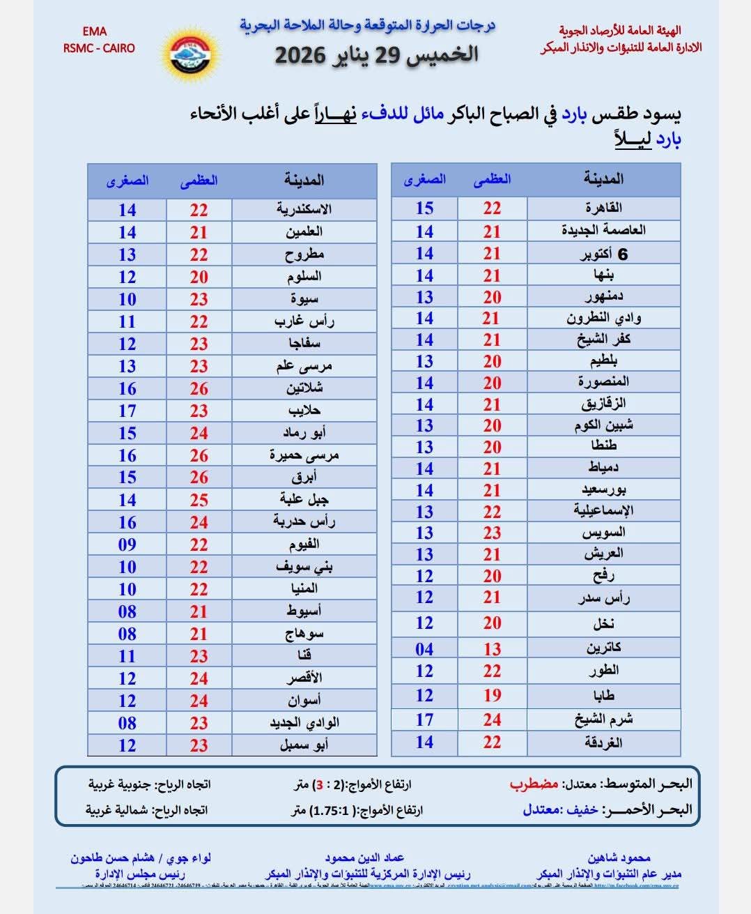 أعلنت الهيئة العامة للأرصاد الجوية، حالة الطقس ودرجات الحرارة غدا الخميس 28 يناير، وذلك بالتزامن مع قرب نهاية شهر طوبة الشهير بانخفاض درجات الحرارة.
