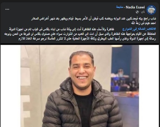 تداول مستخدمو مواقع التواصل نبأ وفاة شاب يدعى أحمد هيثم بعد تعرضه لهجوم من كلاب الشارع خلال عودته من عمله، ما أعاد حالة الجدل حول كلاب الشوارع الضاله.