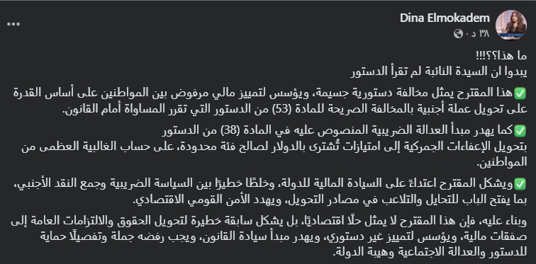 وقالت المقدم، في ردها على المقترح عبر صفحتها بموقع "فيسبوك"، إن النائبة "لم تقرأ الدستور"، مشددة على أن ربط الإعفاءات بالقدرة على تحويل عملة أجنبية يُعد إخلالًا صريحًا بمبدأ المساواة أمام القانون، بالمخالفة للمادة (53) من الدستور، التي تحظر التمييز بين المواطنين لأي سبب.