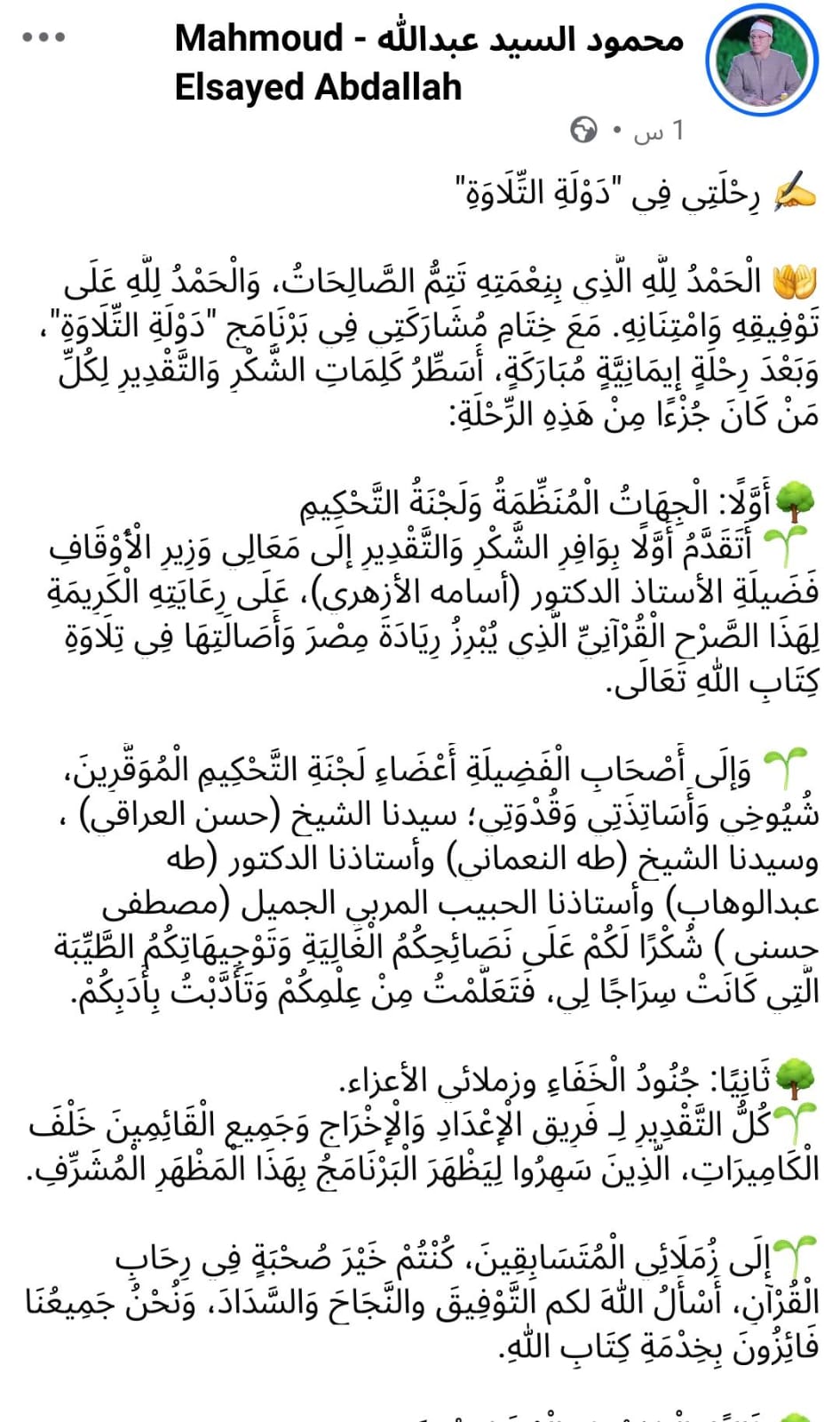 وقال محمود عبر صفحته الرسمية على “فيسبوك”: "الحمد لله الذي بنعمته تتم الصالحات، والحمد لله على توفيقه وامتنانه"، مؤكدًا تقديره لكل من ساهم في هذه الرحلة القرآنية.