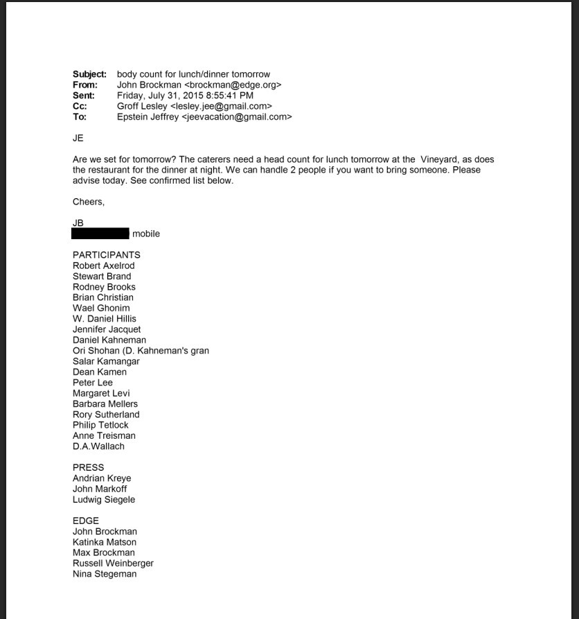 وبحسب الوثيقة، تضمنت إحدى المراسلات قائمة بأسماء مدعوين لمناسبات اجتماعية نظمها أو دُعي إليها إبستين، وكان من بين الأسماء الواردة اسم وائل غنيم، الأمر الذي أثار تساؤلات بشأن سبب إدراج اسمه وطبيعة الدعوة، دون أن تتضمن الوثيقة تفاصيل إضافية بشأن ما إذا كان قد لبّى تلك الدعوات أو طبيعة أي علاقة محتملة.