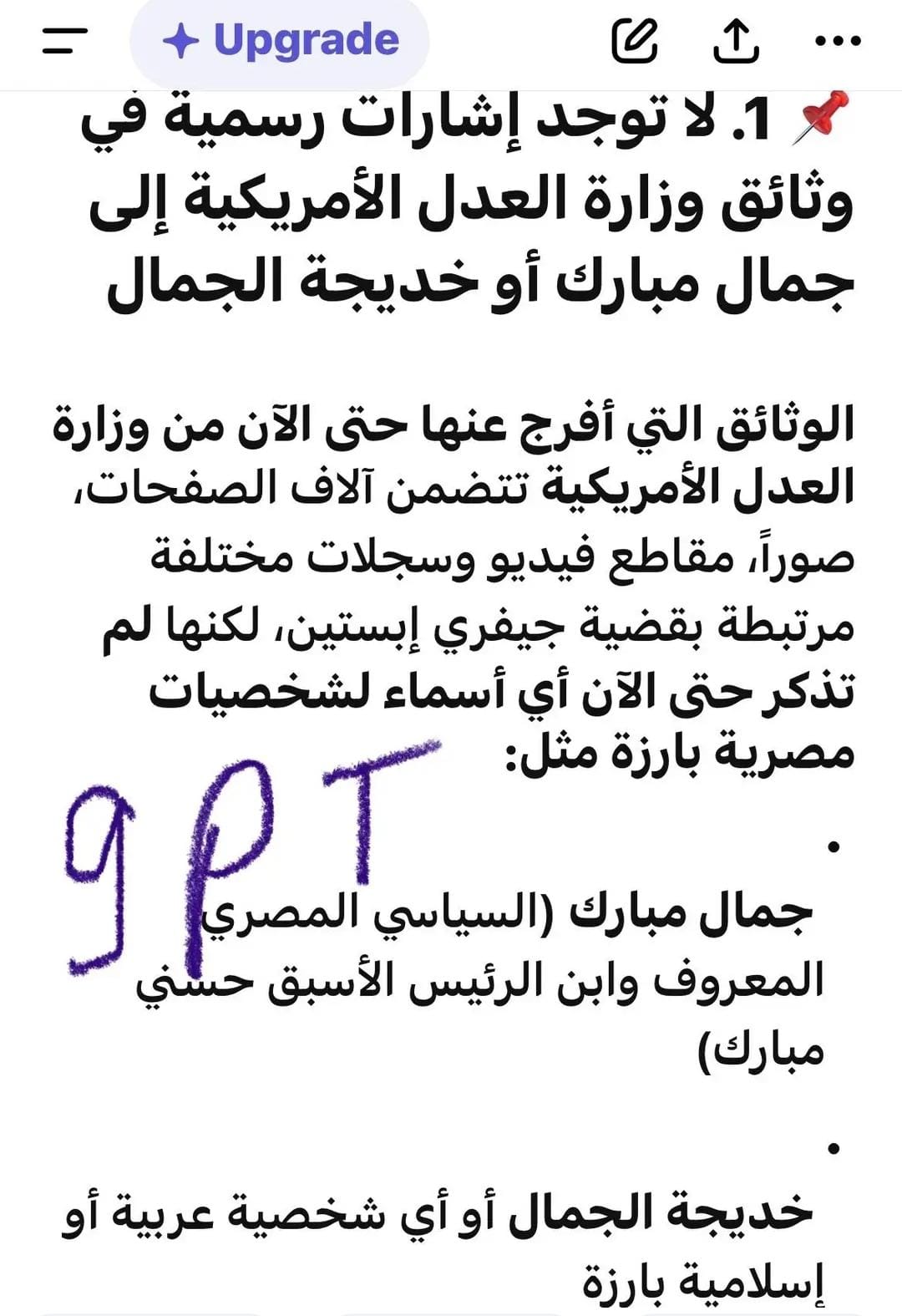 وجاءت الإجابة من خلال التطبيق، أنه لا توجد إشارات رسمية في وثائق وزارة العدل الأمريكية إلى وجود أسماء جمال مبارك أو خديجة الجمال.