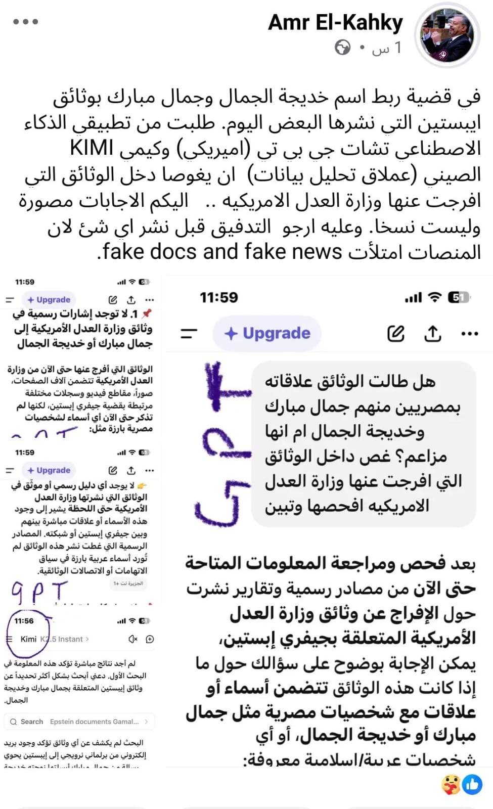 ووجه الإعلامي عمرو الكحكي نفس السؤال إلى تطبيق Kimi، وتبيّن من خلال البحث الدقيق أنه لم تُكشف أي وثائق تؤكد وجود بريد إلكتروني من برلماني نرويجي إلى إبستين يتضمن رسالة من جمال مبارك أرسلتها زوجته خديجة الجمال.
