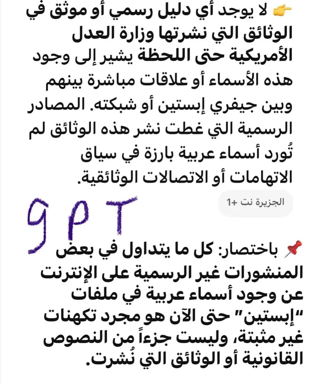 ولخص شات جي بي أن كل ما يتداول في بعض المنشورات غير الرسمية على الإنترنت عن وجود أسماء عربية في ملفات "إبستين" حتى الآن هو مجرد تكهنات غير مثبتة، وليست جزءا من النصوص القانونية أو الوثائق التي نشرت.