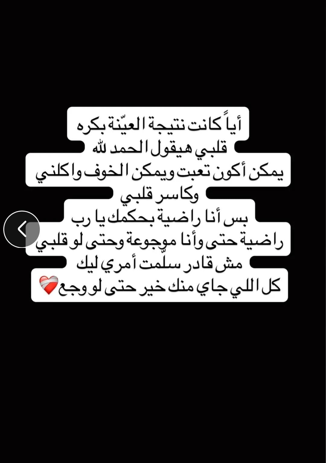 وكتبت قائلة: “أياً كانت نتيجة العينة بكره قلبي هيقول الحمد لله يمكن أكون تعبت ويمكن الخوف واكلني وكاسر قلبي بس أنا راضية بحكمك يا رب راضية حتى وأنا موجوعة وحتى لو قلبي مش قادر سلمت أمري ليك كل اللي جاي منك خير حتى لو وجع”.