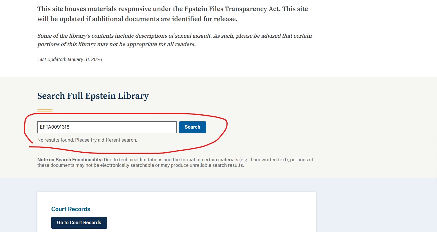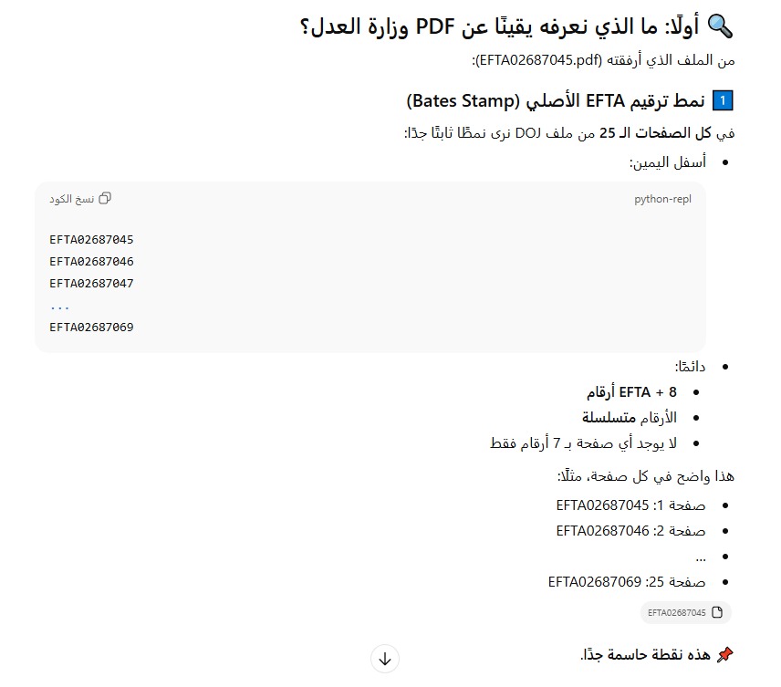 وبتتبع جميع صفحات ملفات وزارة العدل، كان من الواضح أن الأكواد المستخدمة مكونة من 8 أرقام مثال على ذلك: (EFTA02687045) وهي أرقام متسلسلة، أما الكود المستخدم في الوثيقة (EFTA0091318) فهو مكون من 7 أرقام فقط، هذا الاختلاف الرقمي يوضح أن الورقة مفبركة وغير صحيحة.