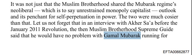 وتصف الوثائق جمال مبارك بأنه ادعى حقه في السلطة وحكم أكثر من 80 مليون مصري، ويشير القيادي الإخواني المحبوس حاليا، خيرت الشاطر في مقابلة له إلى أن جمال بدأ ما أسماه "مشروع التوريث" بشكل فعلي في أواخر عام 2002.