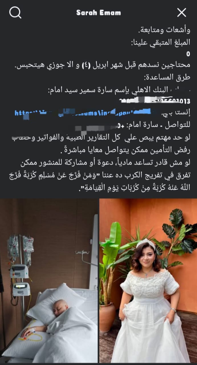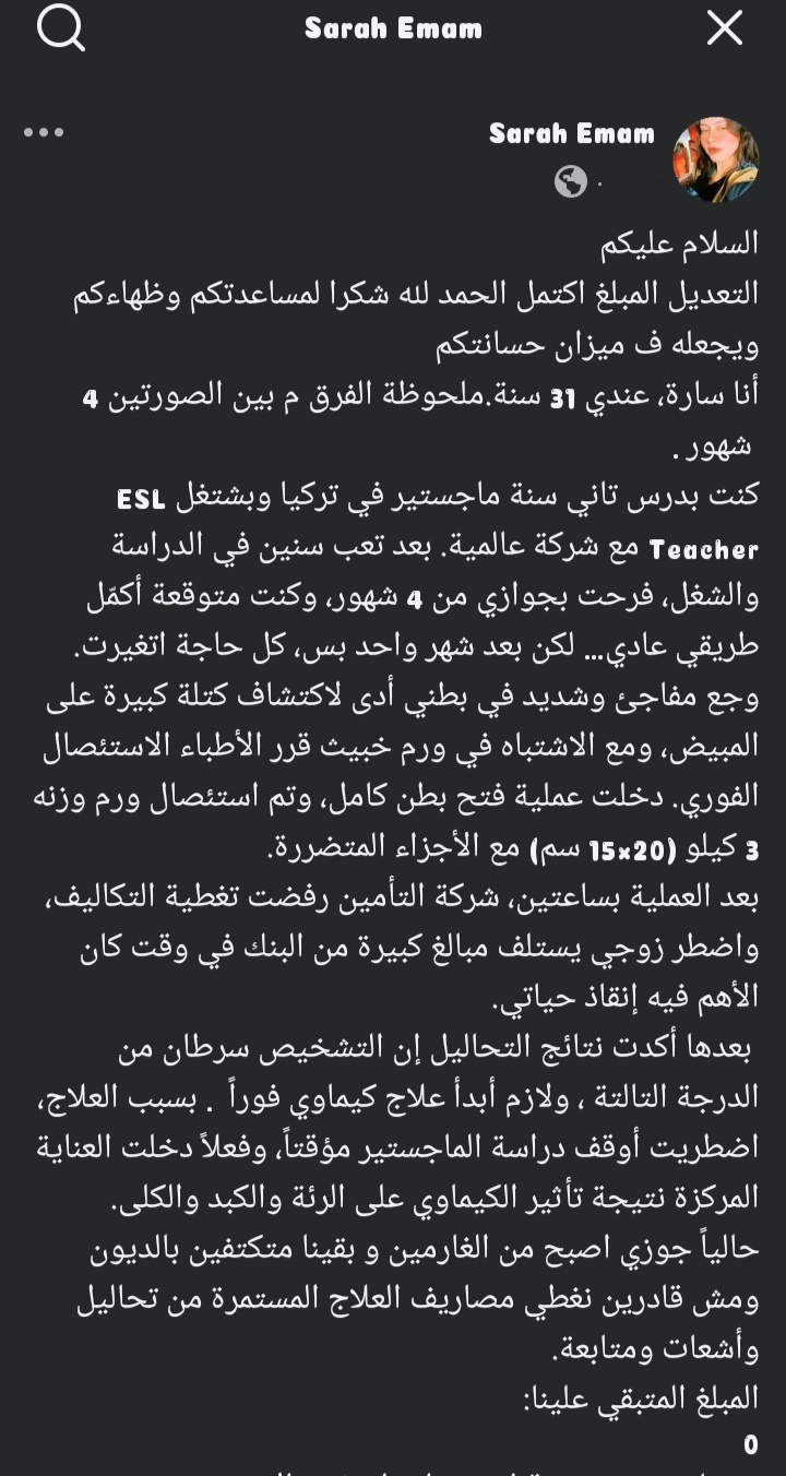 استأنفت:" بعدها أكدت نتائج التحاليل أن التشخيص سرطان من الدرجة الثالثة، ولازم أبدأ علاج كيماوي فوراً، بسبب العلاج، اضطريت أوقف دراسة الماجستير مؤقتاً، وفعلاً دخلت العناية المركزة نتيجة تأثير الكيماوي على الرئة والكبد والكلى، حالياً جوزي اصبح من الغارمين و بقينا متكتفين بالديون ومش قادرين نغطي مصاريف العلاج المستمرة من تحاليل وأشعات ومتابعة، المبلغ المتبقي علينا:385,000 جنيه مصري، ومحتاجين نسدهم قبل شهر أبريل وإلا جوزي هيتحبس".