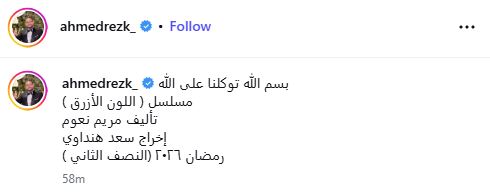 ونشر أحمد رزق عبر حسابه الرسمي على موقع “إنستجرام” البوستر الرسمي لمسلسل ”اللون الأزرق”، وعلّق عليه قائلًا: ”بسم الله توكلنا على الله.. مسلسل اللون الأزرق، تأليف مريم نعوم، إخراج سعد هنداوي، رمضان 2026 (النصف الثاني)”، في تأكيد على عرض العمل خلال النصف الثاني من الموسم الرمضاني المقبل.