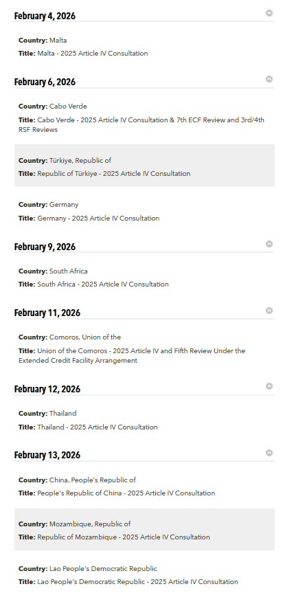 ووفق جدول الأعمال المنشور على الموقع الإلكتروني لصندوق النقد الدولي، الذي جرى تحديثه أمس، فإن الدول المقرر مناقشة برامجها خلال الفترة من غدًا وحتى 13 فبراير الجاري تشمل ملطا والرأس الأخضر، وتركيا، وألمانيا، وجنوب إفريقيا، وجزر القمر، وتانيلاند، والصين، وموزمبيق، ولاوس دون الإشارة إلى إدراج مصر ضمن هذه الاجتماعات.